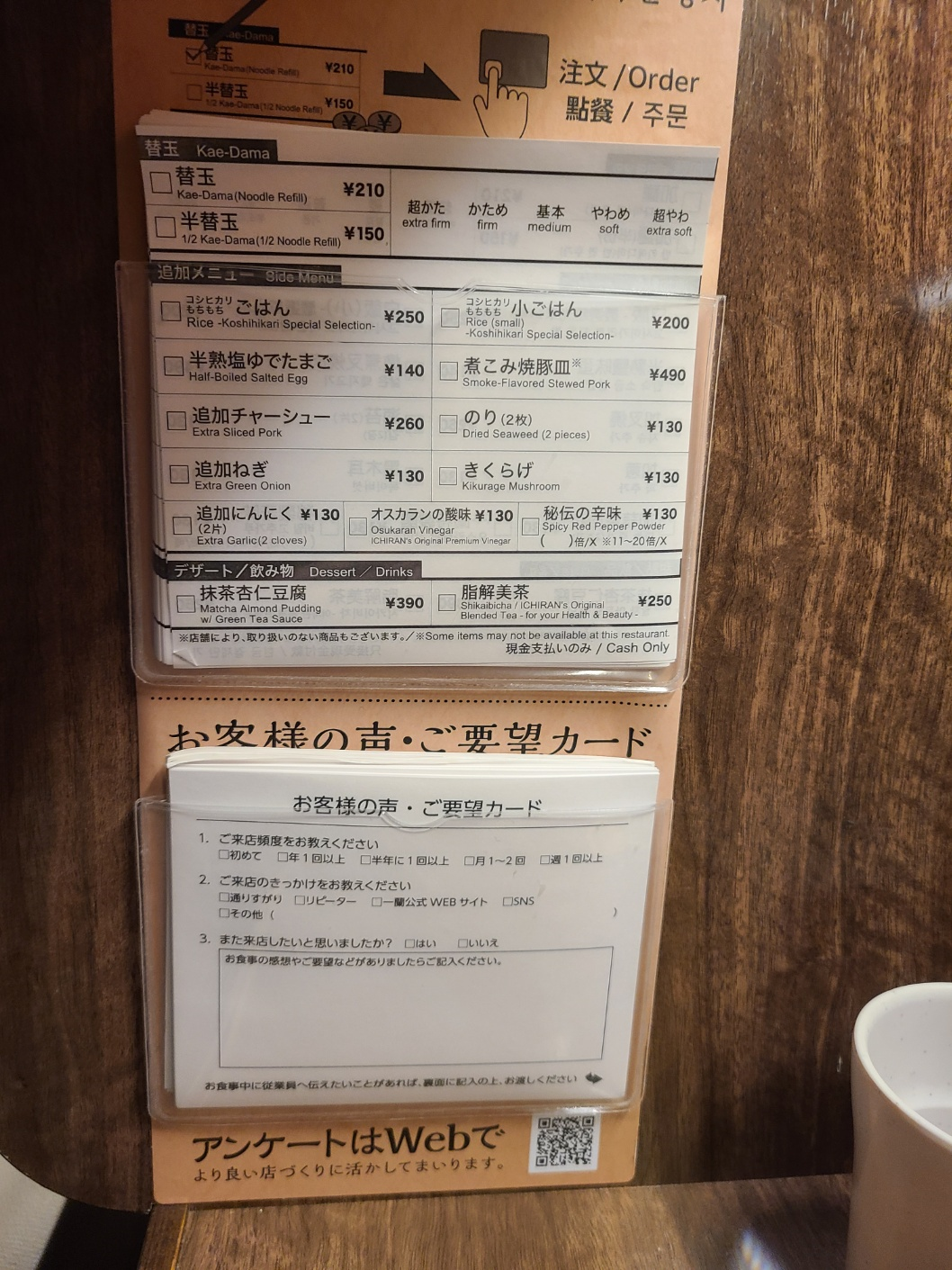 그리고 왼쪽 벽에 보시면 추가적으로 주문할 수 있는 용지가 있습니다. 추가적으로 주문하시려면 볼펜으로 체크후 테이블에 있는 호출 버튼을 누르면 됩니다.